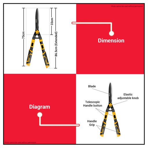 INGCO 710mm-860mm Telescopic Hedge Shears Extendable Garden Hedge Clippers HHS6306 - IHT