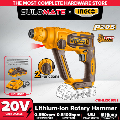 Buildmate Online DepotNo reviewsINGCO 1.5J 20V Cordless Rotary Hammer Drill SDS Plus Concrete Impact Drill For Concrete & Masonry Power Tool - ICPT SPECIFICATION:► Model: CRHL...