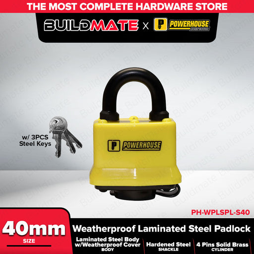 Buildmate Online DepotNo reviewsPowerHouse 40mm Weatherproof Laminated Steel Padlock PH-WPLSPL-S40 PHDH SPECIFICATIONS: Model: PH-WPLSPL-S40► Size: 40mm► Body Material: Laminated ...