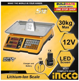 Buildmate Online DepotINGCO 12V Lithium-Ion Rechargeable Wireless Scale 30Kkg SUPER SELECT 12V CES1223 •BUILDMATE• IPT SPECIFICATIONS: ►Max. weight : 30kg ►With 5g grad...