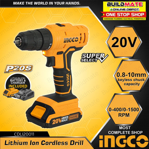Buildmate Online DepotINGCO Cordless Drill SUPER SELECT Lithium-Ion 20V with Battery and Charger CDLI200215 •BUILDMATE• IPT SPECIFICATIONS: ►20V ►2.0Ah ►0-400/0-1500min...