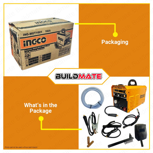 Buildmate Online DepotINGCO Inverter Lift Welding Machine 160A MAG/MIG/MMA/TIG MGT1601 •BUILDMATE• IPT SPECIFICATIONS: ►MAG / MIG / MMA / TIG Lift Inverter Welder ►Inpu...