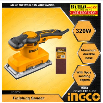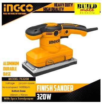 Buildmate Online DepotNo reviewsINGCO Finish Sander 320W FS3208 •BUILDMATE• IPT SPECIFICATIONS: ►Voltage:220V-240V~50/60Hz ►Input power: 320W ►No-load speed:14000rpm ►Bottom base...