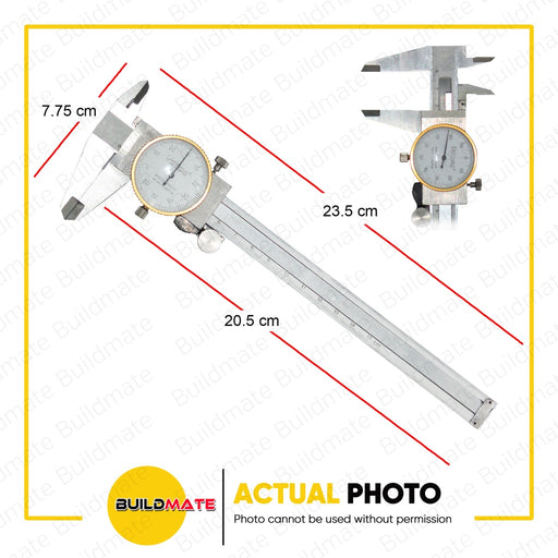 Buildmate Online DepotHOTECHE Dial Caliper 6" Carbon Steel HTC-284415 •BUILDMATE• SPECIFICATIONS: ►Material: #45 Carbon Steel ►Accuracy: 150mm x 0.02mm / 6" x 0.001" ►Hi...