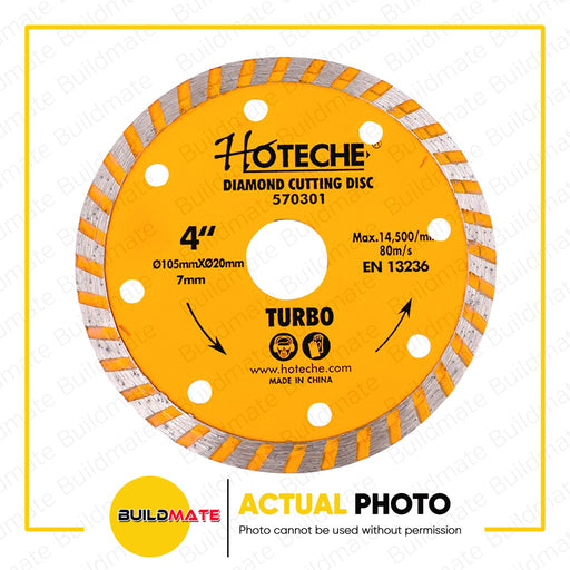 Buildmate Online DepotHOTECHE Diamond Cutting Disc 4" Turbo Type 570301 •BUILDMATE• SPECIFICATIONS: ►4" ►Max. 14500mm ►80m/s ►Ø105mm x Ø20mm