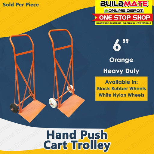 Buildmate Online DepotKARTILYA Orange Hand Push Cart Trolley 6" Black Rubber Wheels | White Nylon Wheels SOLD PER PIECE •BUILDMATE• AVAILABLE IN: ►BLACK RUBBER WHEELS ►...