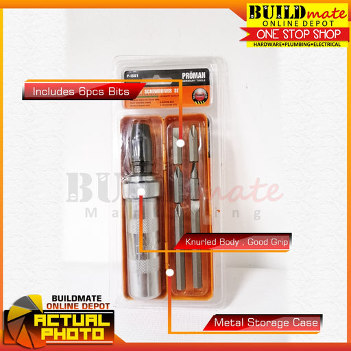 Buildmate Online DepotPROMAN / MEGA Impact Driver with 6pcs Bits Screwdriver Set - BUILDMATESPECIFICATIONS:►Metal Storage Case►Knurled body for good grip►Fully Chromed f...