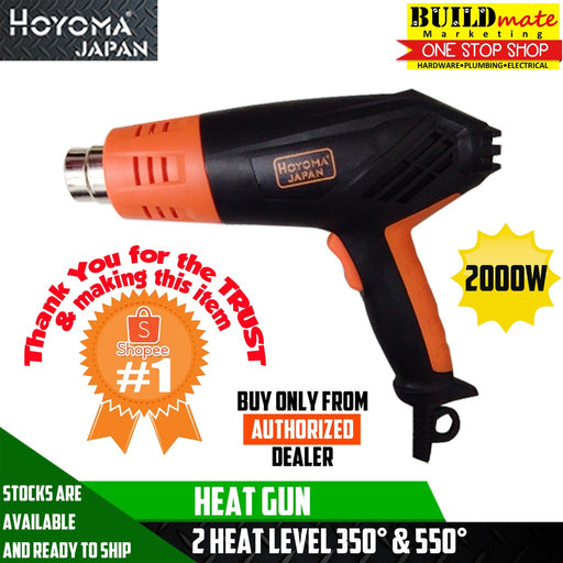 Buildmate Online DepotHoyoma Heat Gun HTHG2000C •BUILDMATE• SPECIFICATIONS: ►2 heat level 350° and 550° ►2000watts ►220volts ►Can be use for Shrinking plastic wraps, Se...