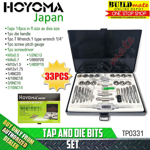 Buildmate Online DepotHoyoma 33PCS/SET Tap and Die Bits Set TP0331 •BUILDMATE• THIS SET INCLUDES: •Taps 14pcs in ff.size as dies size •1pc die handle •1pc T Wrench.1 ty...