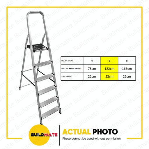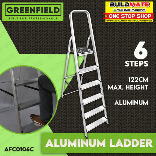 Buildmate Online DepotGREENFIELD 6 STEP Aluminum Home Ladder AFC0106C- 06-04-00006 •BUILDMATE• SPECIFICATIONS: ►Total steps: 6 ►Max working height: 122cm ►Open size: ...