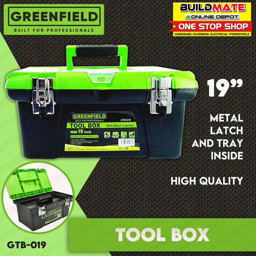 Buildmate Online DepotGREENFIELD Tool Box 19" with Metal Latch and Tray Inside •BUILDMATE• SPECIFICATIONS: ►19" ►2 pull out organizer ►With Metal Latch and Tray Inside ...