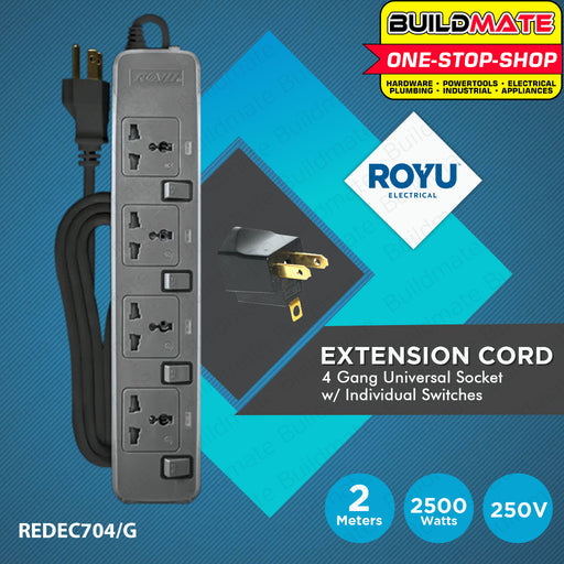 Buildmate Online DepotROYU 4 GANG Extension Cord with Individual Switches REDEC704 •BUILDMATE• SPECIFICATIONS: ►Rated Voltage: 250V ►Max. Current: 10A ►Max. Power: 2500...