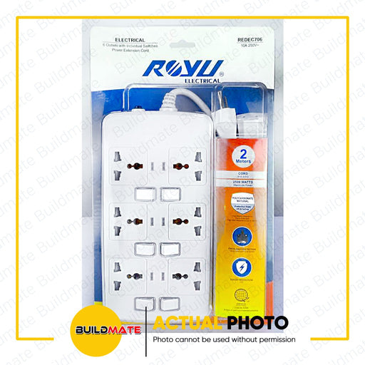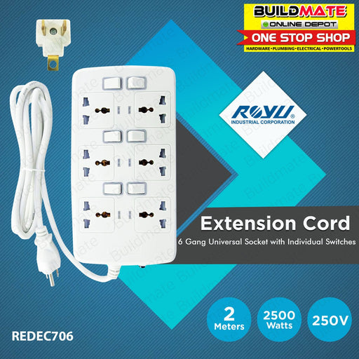 Buildmate Online DepotROYU 6 GANG Extension Cord Universal Socket with 1 Individual Switch REDEC706 •BUILDMATE• SPECIFICATIONS:►Rated Voltage: 250V►Max. Current: 10A►Max...