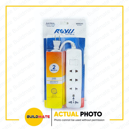 Buildmate Online DepotROYU Extension Cord with Universal Outlet REDEC613 •BUILDMATE• SPECIFICATIONS: ►Cord length: 2 Meters ►Maximum wattage: 2500 Watts ►Child protect ...