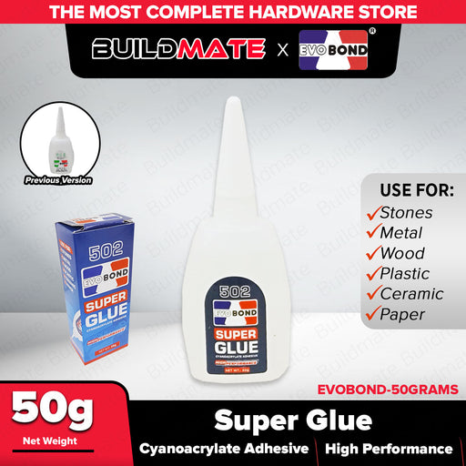 Buildmate Online DepotEVO BOND Cyanoacrylate Evobond Adhesive Glue DIY Crafts 50g •BUILDMATE• SPECIFICATIONS:► Capacity: 1 bottle (50g)► Transparent and Colourless► Sam...