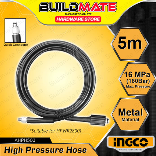 Buildmate Online DepotBUILDMATE Ingco High Pressure Washer Hose 5m 16MPa/160Bar Power Washer Replacement Quick Connector Hose AHPH503 - IHT SPECIFICATION:►Model: AHPH503...