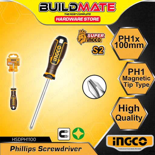 BUILDMATE Ingco Phillips Screwdriver PH1x100mm Crosshead Magnetic Screw Driver Hand Tools For Electronics & DIY HSDPH1100 - IHT
