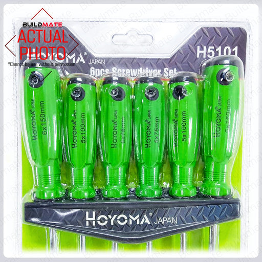 Buildmate Online DepotHOYOMA Magnetic Screwdriver 6PCS/SET H5101 •BUILDMATE• HYMHTTHIS SET INCLUDES:►Ph2x150mm►Ph1x100mm►Ph0x75mm►flat: 3 x75mm►flat: 5x 100mm►flat: 6x150mm