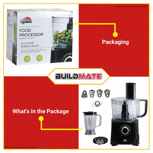 Buildmate Online DepotKYOWA Multifunction Food Processor 1.8L with 6 Interchangeable Blades KW-4651 •BUILDMATE• SPECIFICATIONS: ►1.8L Plastic jar capacity ►220v/60Hz ►H...