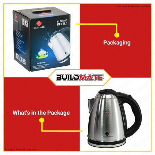 Buildmate Online DepotMICROMATIC 1.8L Stainless Electric Cordless Kettle MCK-1840 •BUILDMATE• SPECIFICATIONS:►Capacity: 1.8L ►Automatic switch off with dry-boil protecti...
