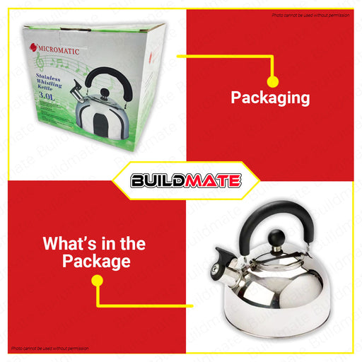 Buildmate Online DepotMICROMATIC Whistling Stainless Kettle 3L MK-30 •BUILDMATE•SPECIFICATIONS:►Capacity: 3L►Heat resistant handle and knob►The handle and knob stays coo...
