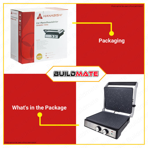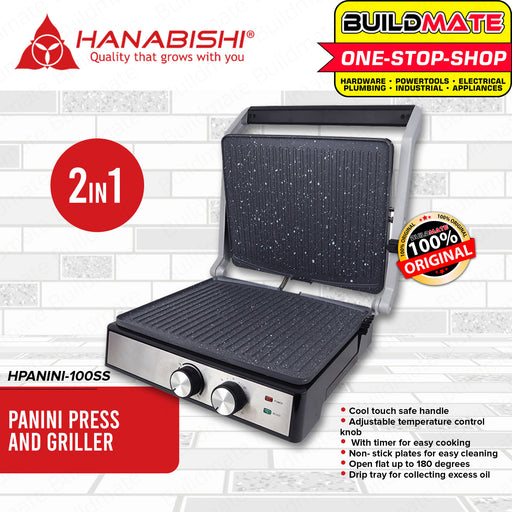 Buildmate Online DepotHANABISHI 2 IN 1 Panini Press and Griller HPANINI100SS •BUILDMATE• SPECIFICATIONS: ►Cool touch safe handle ►Adjustable temperature control knob ►Wi...