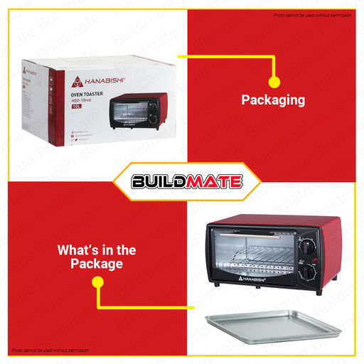 Buildmate Online DepotHANABISHI Oven Toaster 10L HEO-10RED •BUILDMATE• SPECIFICATIONS: ►10-liter capacity ►60-minute timer with bell ring ►100-250°C temperature ►2 pcs. ...