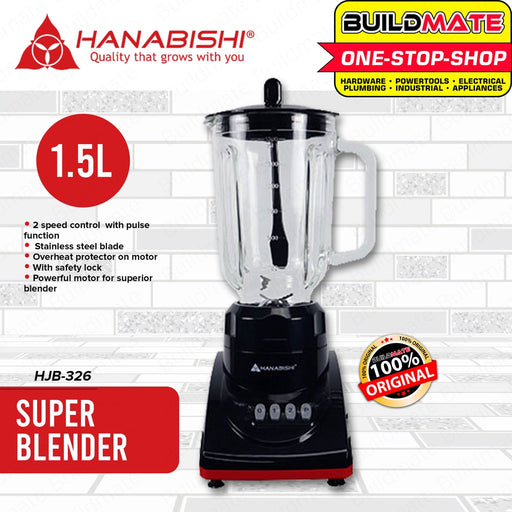 Buildmate Online DepotHANABISHI Juice Blender 1.5L with 2 Speed Control Pulse Function HJB-326 •BUILDMATE• SPECIFICATIONS: ►1.5-liter glass jar ►2 speed control with pu...