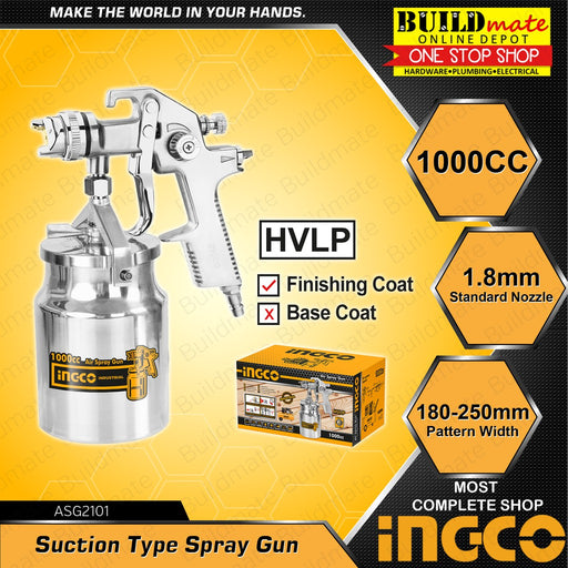 Buildmate Online DepotINGCO HVLP Suction Type Spray Gun ASG2101 1000CC •BUILDMATE• SPECIFICATIONS: ►Standard nozzle:1.8mm ►Pattern width:180-250mm ►Paint capacity:1000cc...