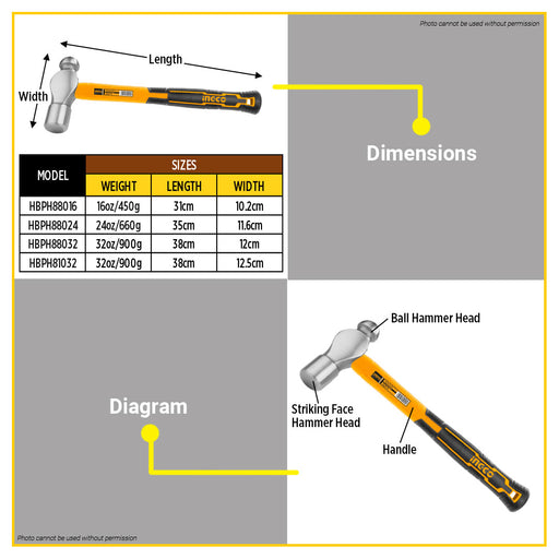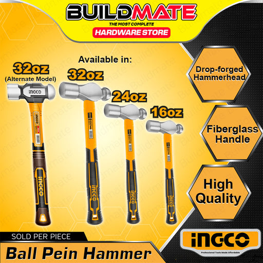 Buildmate Online DepotBUILDMATE Ingco Ball Pein Hammer 16oz - 48oz Ballpein Ball-peen Hardwood Handle Double Striking Heads Hammerhead - IHTAVAILABLE IN:►16oz - HBPH0401...