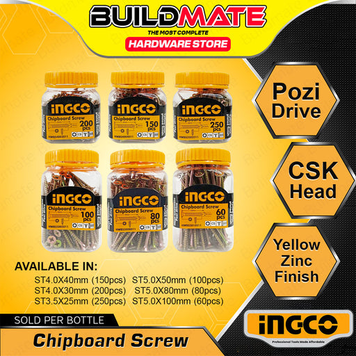 BUILDMATE Ingco Chipboard Screw Yellow Zinc Plated Finish Flat Head Pozi Drive Woodworking Screws SOLD PER BOTTLE - IHT