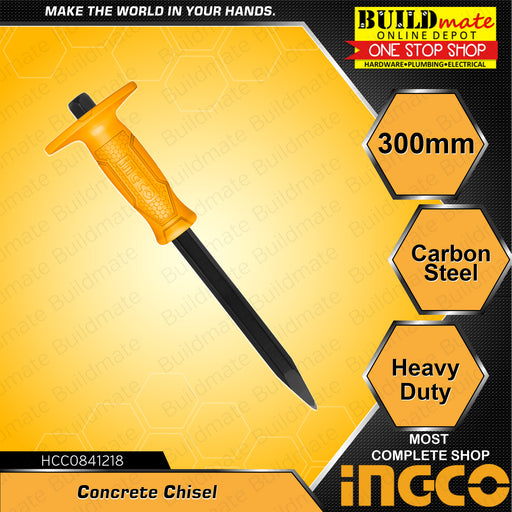 Buildmate Online DepotINGCO Concrete Chisel 300mm •BUILDMATE• AVAILABLE IN: ►300mm SPECIFICATIONS: ►INGCO Style Handle ►Material:45# ►Carbon steel ►Drop forged and hea...