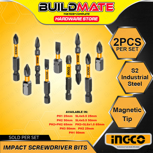 BUILDMATE Ingco 2PCS/SET Impact Screwdriver Bits 25MM - 65MM Black Surface with Magnet Phillips IHT