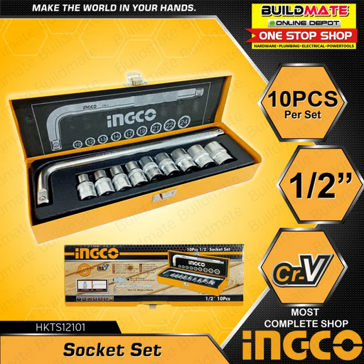 Buildmate Online DepotINGCO 10PCS/SET Socket Set 1/2" CR-V HKTS12101 •BUILDMATE• IHT SPECIFICATIONS: Socket set 10 pcs. 1/2 " INGCO HKTS12101 INDUSTRIAL is used in con...