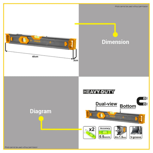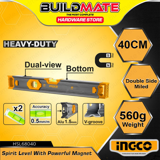 Buildmate Online DepotBUILDMATE Ingco 40CM Spirit Level with Powerful Magnets Double Side Milled Aluminum Bubble Leveler Measuring Leveling Tool HSL68040 - IHTSPECIFICAT...