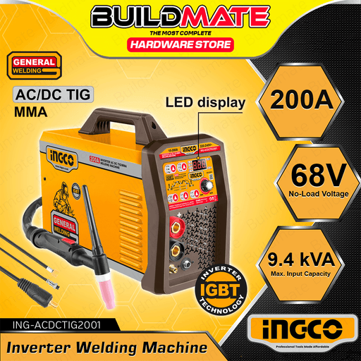 Buildmate Online DepotBUILDMATE Ingco Inverter AC/DC TIG/MMA Welding Machine 200A Portable Inverter Welder with LCD Display ING-ACDCTIG2001 - IPT SPECIFICATION:►Model: I...