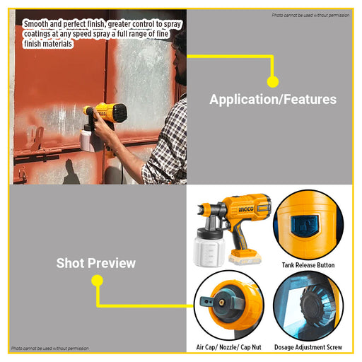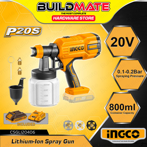 Buildmate Online DepotBUILDMATE Ingco 20V Lithium-Ion Cordless Spray Gun 800ML Paint Spray HVLP Sprayer Gun Power Painter Power Paint Zoom CSGLI20406 - ICPT SPECIFICATIO...