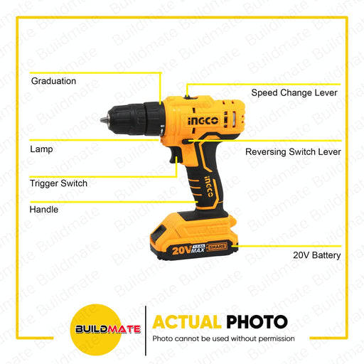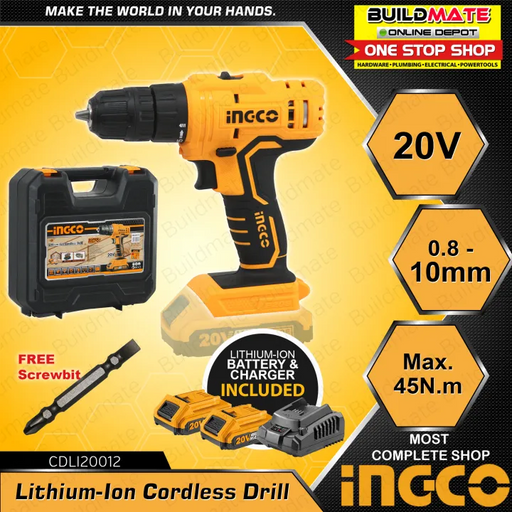 Buildmate Online DepotINGCO 20V Lithium-Ion Cordless Drill with 2x Battery 1x Charger with FREE Screw Bit CDLI20012 •BUILDMATE• ICPT SPECIFICATIONS: Voltage:20V No-load...