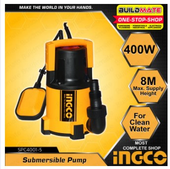 Buildmate Online DepotBUILDMATE INGCO 400W Copper Motor Clean Water Submersible Pump 8-meter SPC4008-5 IPTSPECIFICATIONS:►Model: SPC4008-5►Voltage: 220-240V~60Hz►Rated P...