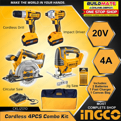 Buildmate Online Depot[COMBO] INGCO Lithium-Ion Cordless 4PCS COMBO KIT CKLI2010 •BUILDMATE• IPT Cordless Circular Saw - CSLI1401 ►Voltage: 20V ►No-load speed:3600rpm ►...