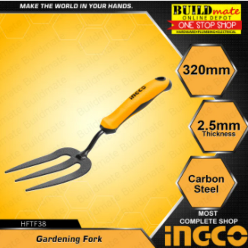 Buildmate Online DepotBUILDMATE Ingco Gardening Fork 320x80x2.5mm Carbon Steel Garden Spading Digging Fork HFTF38 • IHTSPECIFICATIONS:►Total lenght:320mm►Unique design I...