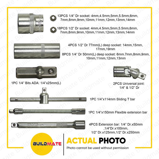 Buildmate Online DepotINGCO Hand Tools Set 100 PCS/SET HKTHP1001 100% ORIGINAL / AUTHENTIC •BUILDMATE• IHT SPECIFICATIONS: ►18 PCS - 1/2" Hexagonal Socket ►13 PCS - 1/4...