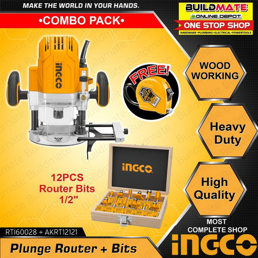 Buildmate Online Depot[COMBO] INGCO Plunge Router 1600W RT160028 + 12PCS Router Bits 1/2" AKRT12121 +FREE •BUILDMATE• IPT SPECIFICATIONS:Plunge Router 1600W RT160028 ...