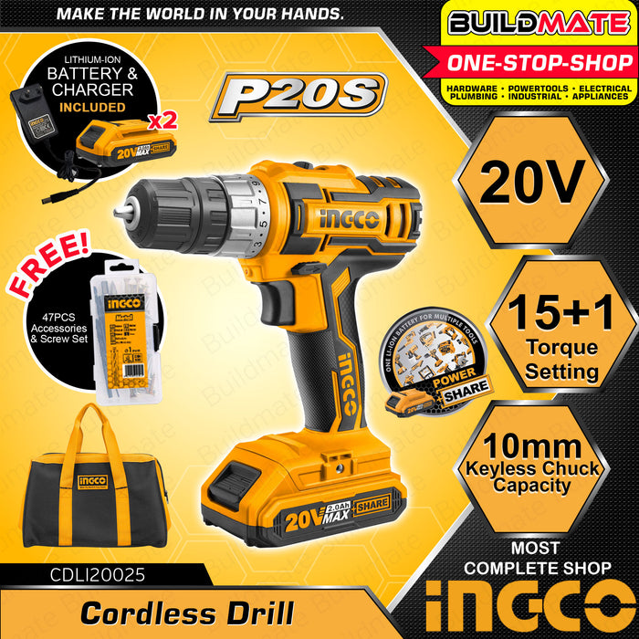 INGCO Lithium-Ion Cordless Drill Driver 20V CDLI20025 POWERSHARE •BUILDMATE• IPT