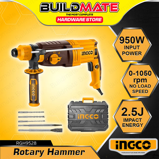 Buildmate Online DepotINGCO 950W SDS 28MM Rotary Hammer Drill with 3 Drills 2 Chisel and Case RGH9528 •BUILDMATE• IPT SPECIFICATIONS: ►Model RGH9528 ►Voltage: 220‐240V~...