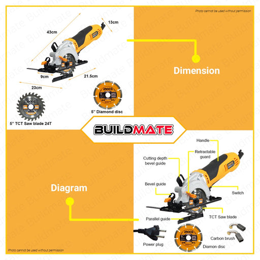 Buildmate Online DepotINGCO Circular Saw 9" 2200W CS2358 +FREE TAPEMEASURE •BUILDMATE• SPECIFICATIONS: ►Voltage:220-240V~50/60Hz ►Input power:2200W ►No-load speed:3800r...