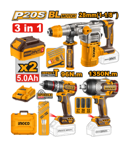 Buildmate Online DepotNo reviewsINGCO 20V Cordless 3pcs Combo Kit Set | Rotary Hammer, Impact Wrench, Impact Drill COSLI250281 ICPT - BUILDMATE SPECIFICATIONS: ► Model: COSLI25028...