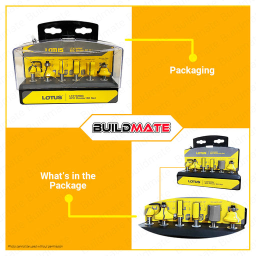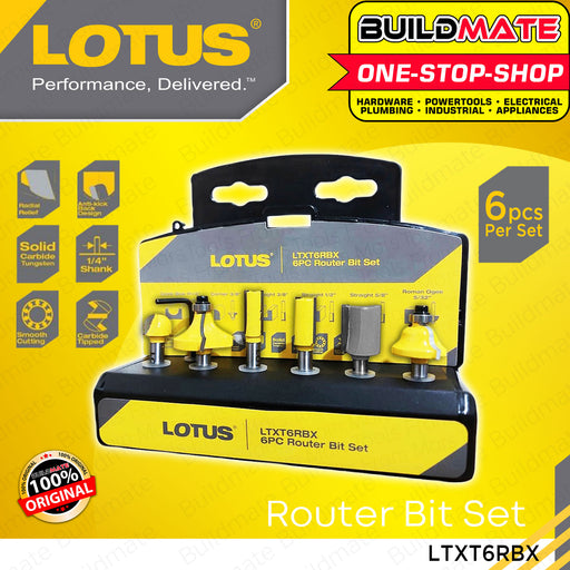 LOTUS 6PCS/SET Router Bit Set LTXT6RBX •BUILDMATE• LPA SPECIFICATIONS: ►Model: LTXT6RBX ►6PCS/SET ►1/4" ►Hardwood and Softwood ►Carbide Tipped ►Hi...