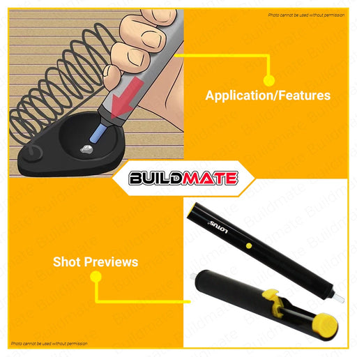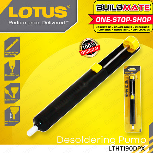 Buildmate Online DepotLOTUS Desoldering Pump LDPP12 •BUILDMATE• LHT SPECIFICATIONS: ►Replaceable Tip ►Self Cleaning tip ►Fast Action automatic solder sucker ►Plastic h...