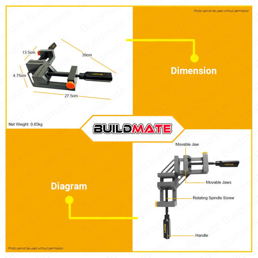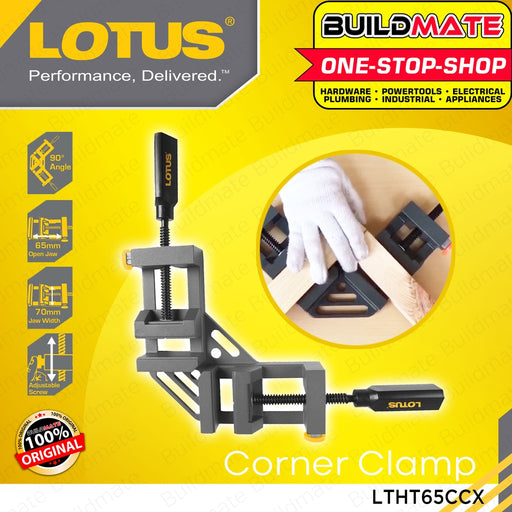 Buildmate Online DepotLOTUS Corner Clamp Quick 90° 65mm LTHT65CCX •BUILDMATE• LHT SPECIFICATIONS: ►90° angle ►Open Jaw: 65mm ►Jaw width: 70mm ►Adjustable screw